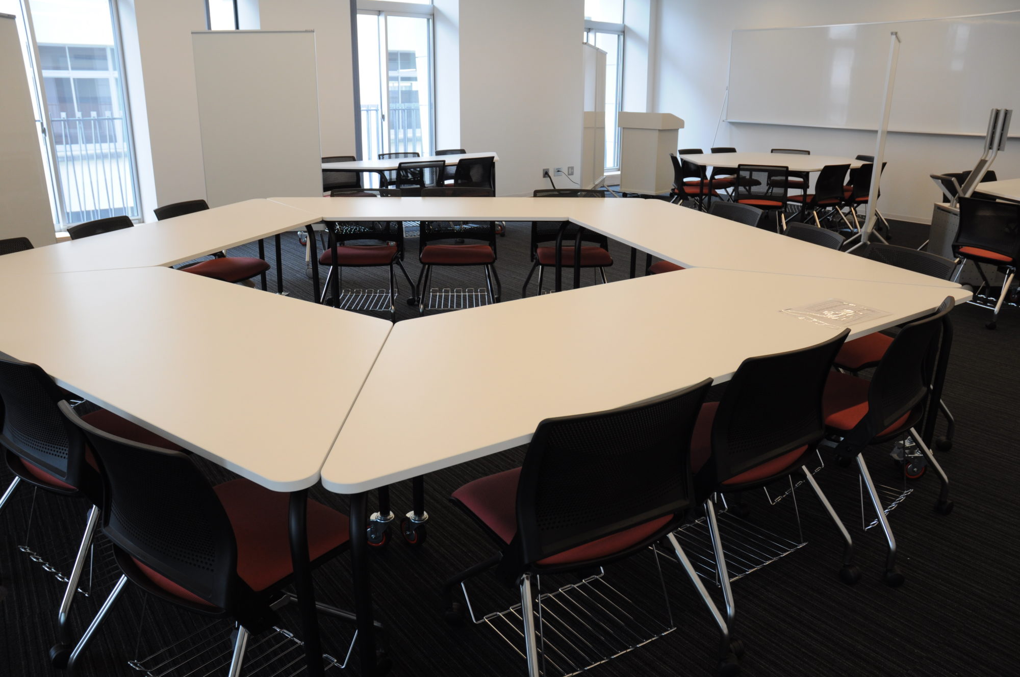 学生が自主的に学ぶ姿勢を育む「アクティブラーニング室」。ここでは、建築家でもある教員の「思いやりのある自己主張」に触れることができる。アクティブラーニング室には、組み合わせ次第で4人・6人…と授業に応じたレイアウトが可能になる「台形型デスク」が設置されている。これは、建築学科教員の要望で用意された特注品である。 “アクティブラーニング”はグループ学習やディスカッションなど様々な形態をとる。つまり、教室の目的を理解すればこのデスクが何故このデザインなのかも理解できるはずだ。教室の機能を最大限生かすために家具や什器にまでこだわる。建築に携わる者の「こだわる」ことへの大切さを、アクティブラーニング室を使う度、学生は実感するのだろう。